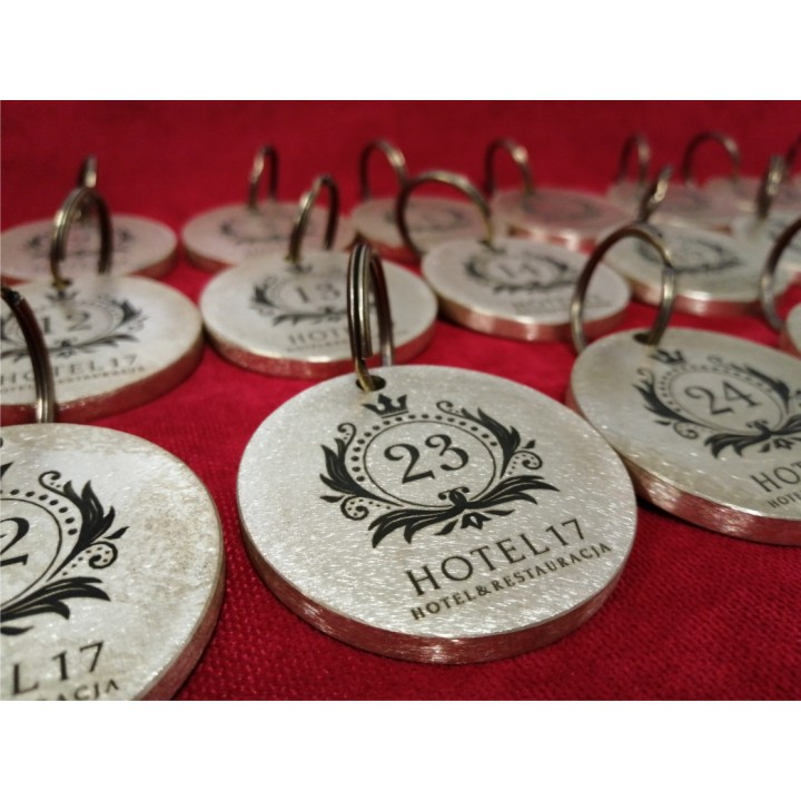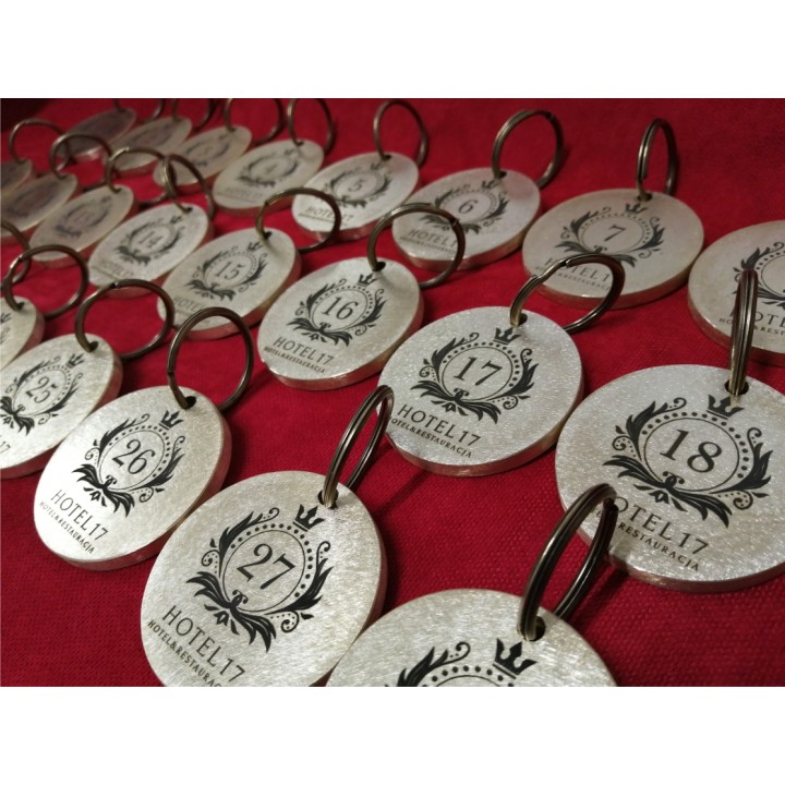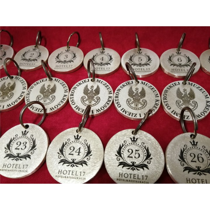 Breloki o grubości 5 mm i średnicy 50 mm, z obustronnym grawerem laserowym.