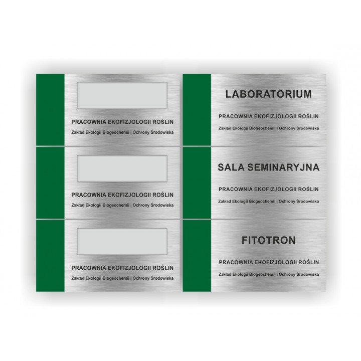 Tabliczki wykonane z dibondu srebrnego w wersji szczotkowanej z naklejką w dowolnym kolorze.