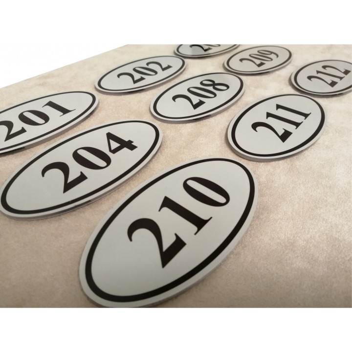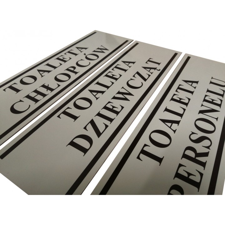 Tabliczki wykonane z plexi(PVC) z naklejką w dowolnym kolorze. Całość podklejona taśmą dwustronną do szybkiego i łatwego montażu.
